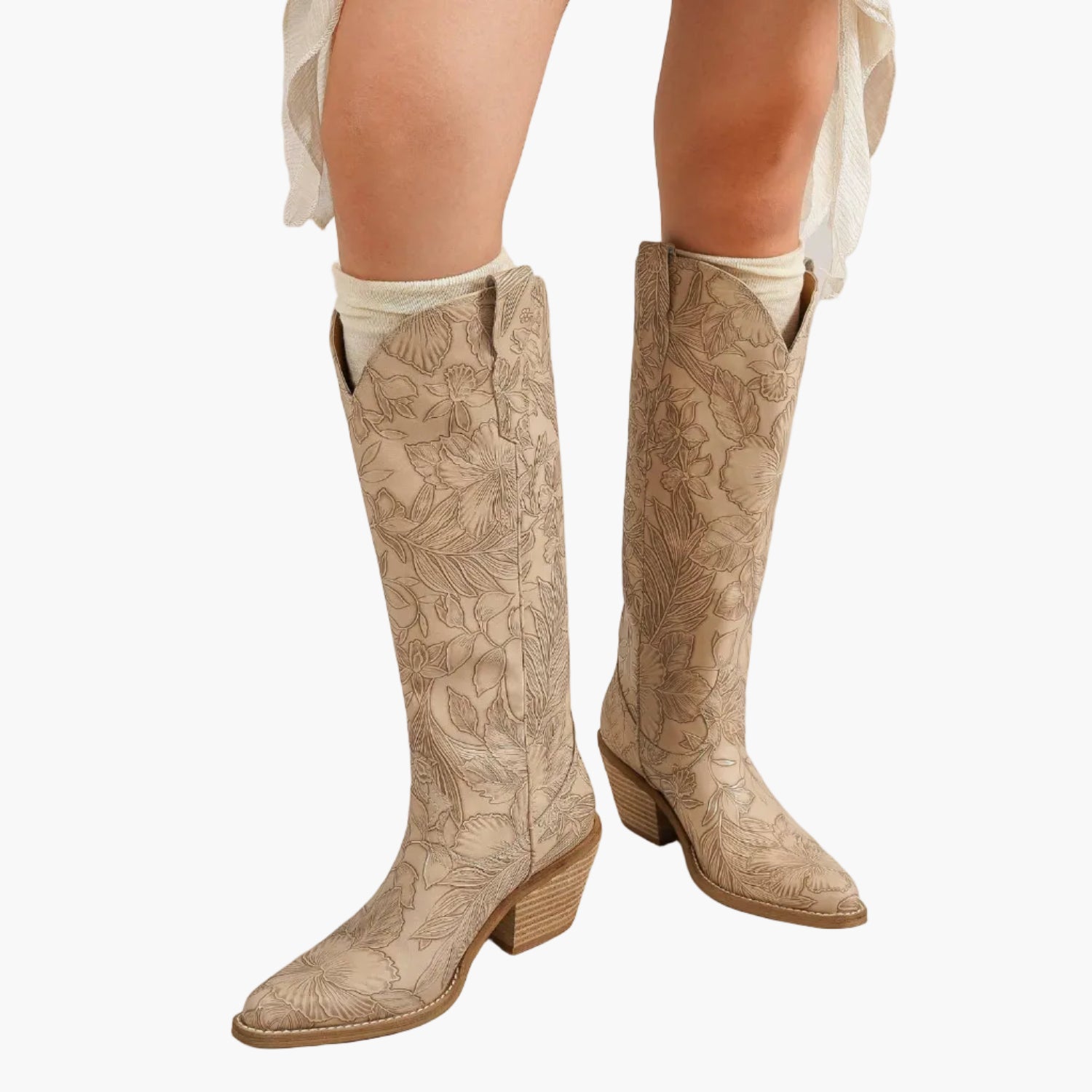 Embossed Floral Western Boots combine classic western style with intricate floral embossing for a standout look. Featuring a pointed toe and a mid-height heel, these boots are perfect for making a statement while ensuring comfort. The pull-on design with side tabs makes them easy to wear, while the floral detailing adds a feminine touch to the rugged silhouette.