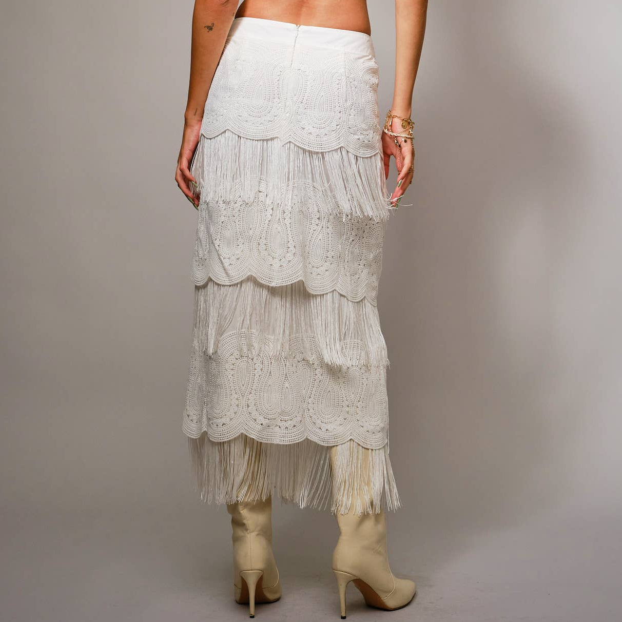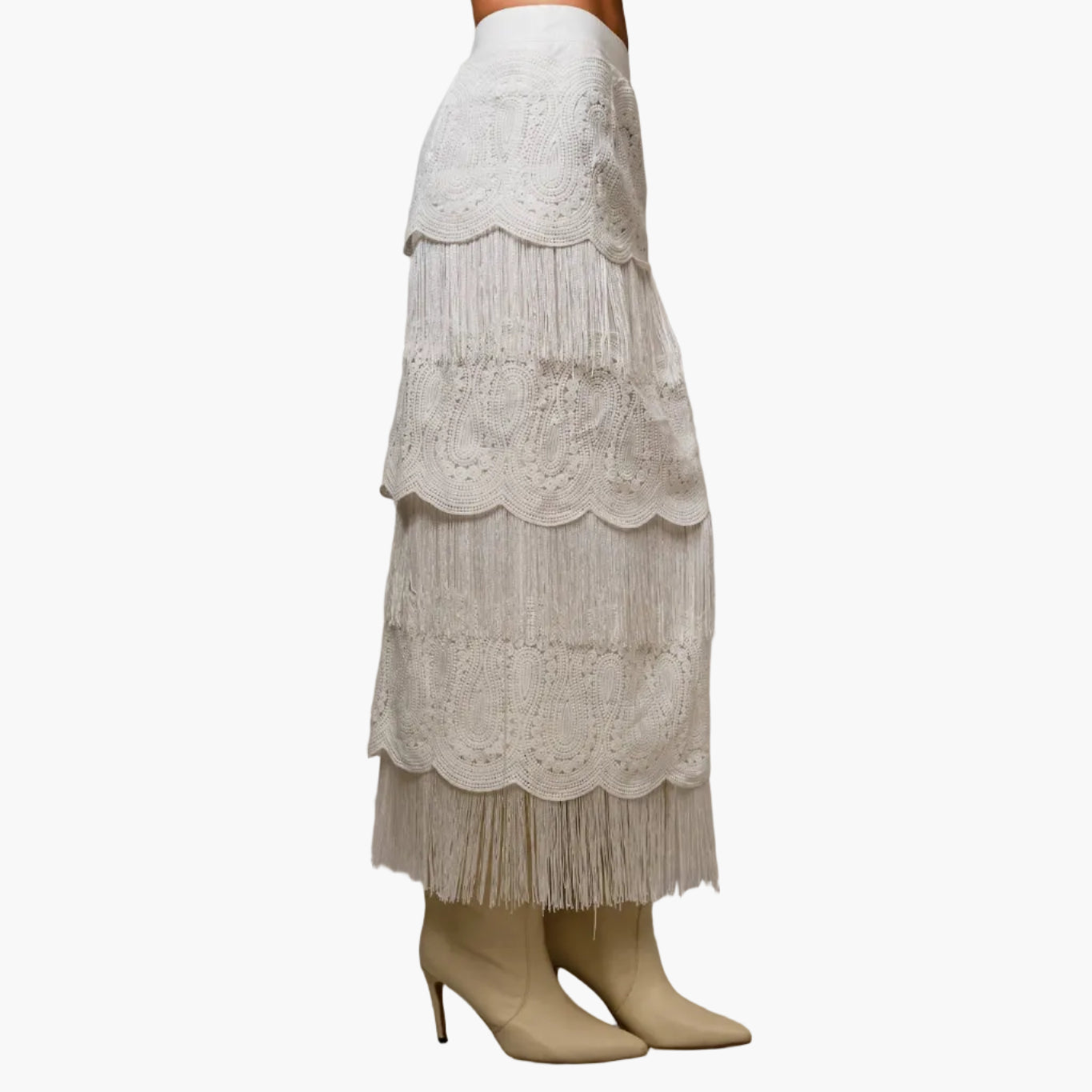 Tiered Western Lace & Fringe Maxi Skirt