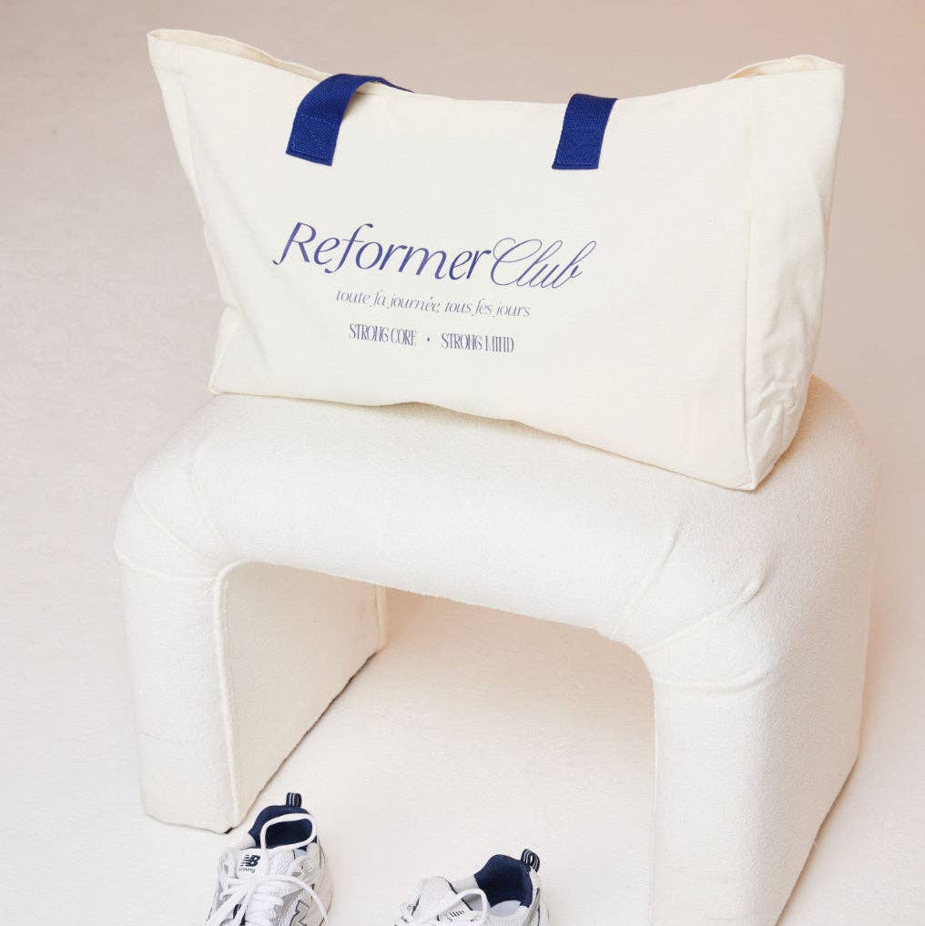 Elevate your everyday carry with the Reformer Club Tote Bag—a sleek and versatile essential for your active lifestyle. Crafted from durable, high-quality fabric, it offers a spacious main compartment for gym gear, yoga essentials, or daily must-haves. Reinforced handles ensure comfort, while the minimalist design and signature Reformer Club logo add a polished finish. From the studio to the market or a weekend getaway, this tote blends practicality with chic simplicity.